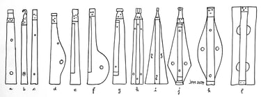 D'autres (g, h, i, j, k) semblent représenter les résultats d'essais d'amélioration de l'instrument d'origine, et peuvent constituer des états intermédiaires témoignant de l'évolution de l'instrument originel vers le dulcimer actuel.